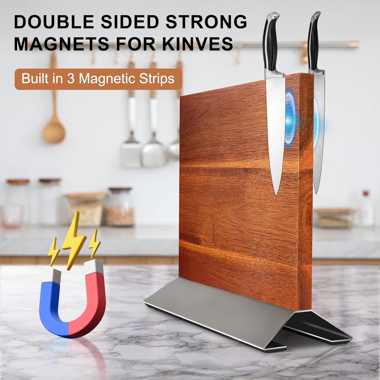 This magnetic knife holder features ultra-strong magnets that provide a secure and effortless way to store your knives. Each knife is drawn in and held firmly in place, ensuring your collection remains organized, neat, and safely stored without slipping or shifting—even during daily use.