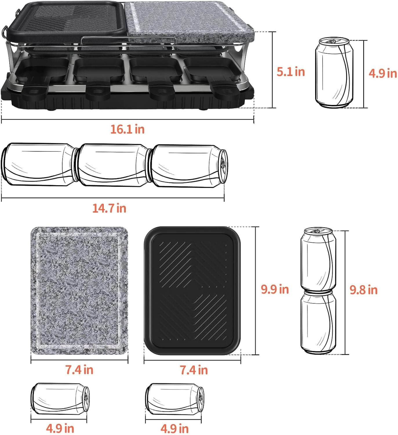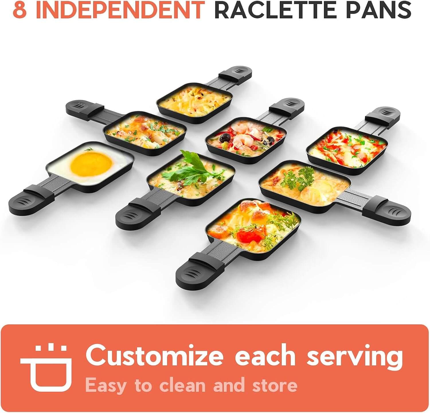 - Perfect for Group Gatherings: Equipped with 8 individual raclette pans, this grill allows you to prepare a variety of foods simultaneously, making it ideal for family meals and social gatherings. From melting cheese to creating savory sauces, the options are endless. Plus, all plates are detachable for easy cleaning and convenient storage.