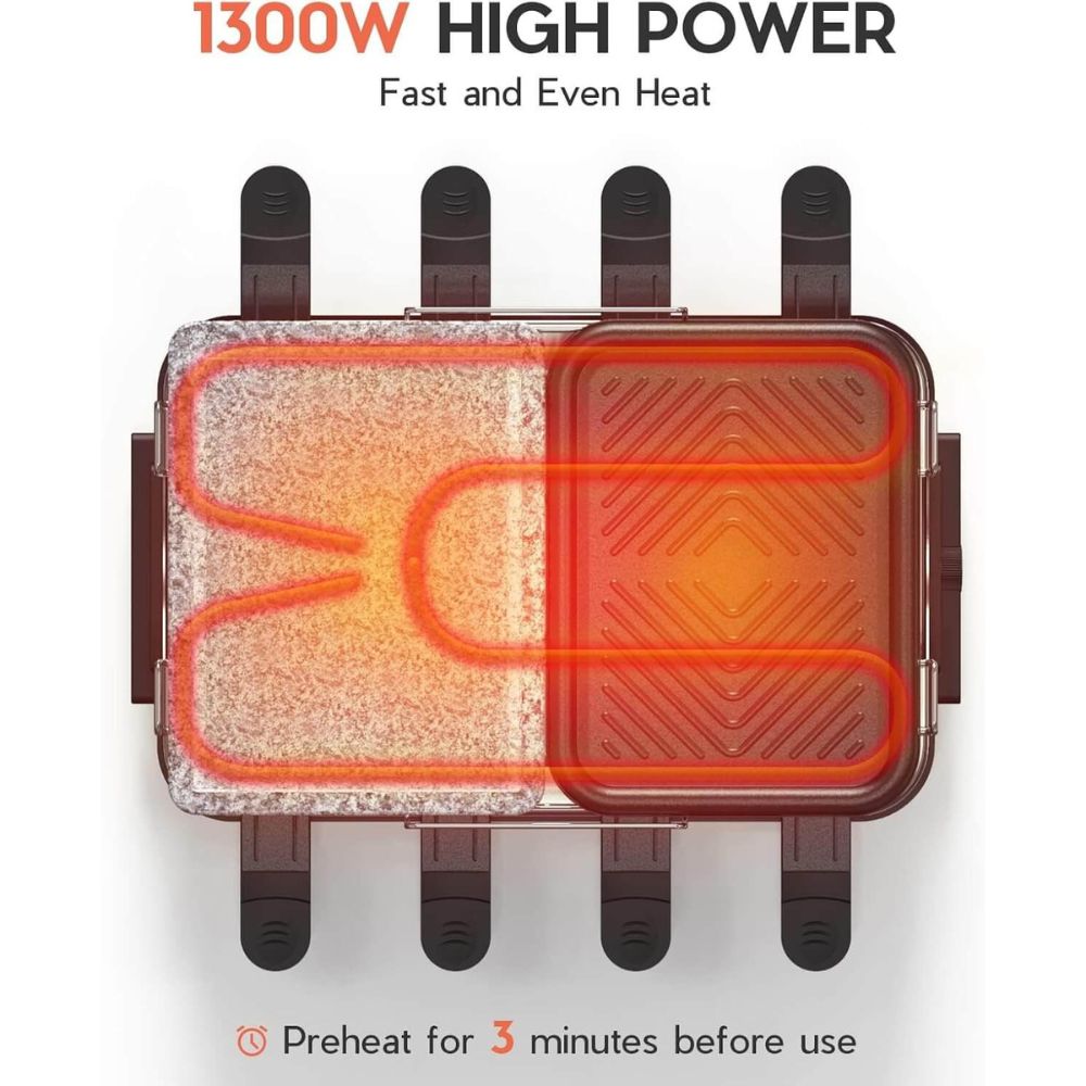 - High-Powered Non-Stick Performance: With a powerful 1300W heating element, this raclette grill quickly reaches temperatures up to 500℉ in just 3 minutes. Effortlessly cook meat, seafood, and steak to perfection. The adjustable temperature knob lets you customize heat levels, ensuring every dish is cooked just the way you like it.