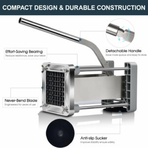 - SPACE-SAVING AND EASY TO CLEAN: Unlike bulky commercial French fry cutters available in the market, this potato cutter boasts a compact size without compromising on its commercial-grade quality. It can be easily cleaned with water, eliminating concerns about rinsing and rust. Experience hassle-free potato cutting with this user-friendly tool.