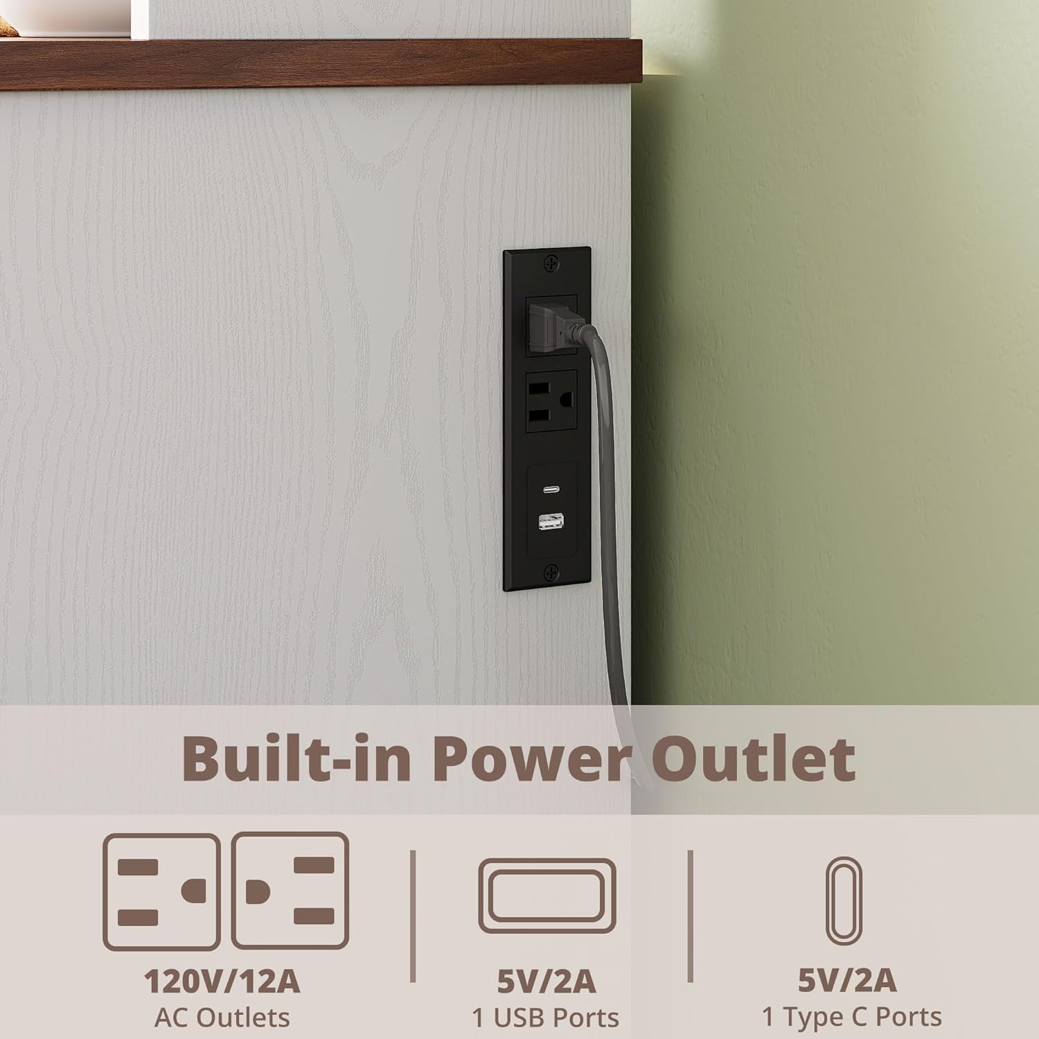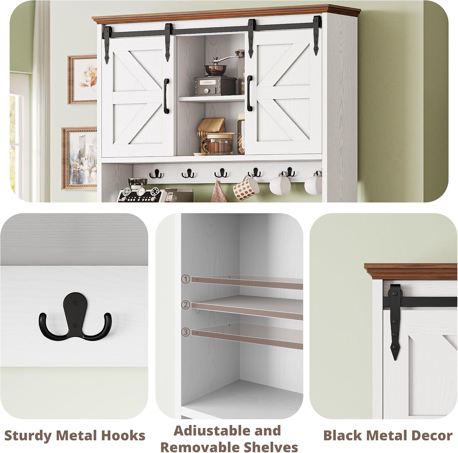 Equipped with a built-in charging station, the cabinet includes 2 USB ports and 2 power sockets to charge appliances and devices while keeping your countertop neat and wire-free. The farmhouse style is enhanced by X-door panels, sliding barn doors, and vintage metal handles, giving your home a charming, rustic appeal. Plus, an anti-tip kit ensures safety by securing the cabinet to the wall.