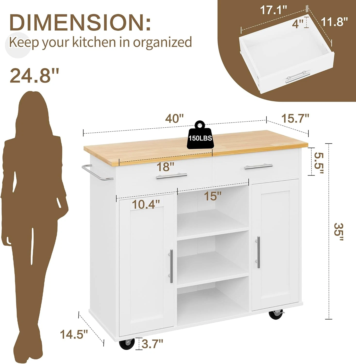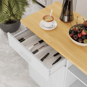 Crafted with a strong rubberwood surface, the tabletop resists stains and water, making it ideal for busy kitchens. Its large, sturdy platform supports small appliances and daily kitchen tasks with ease.