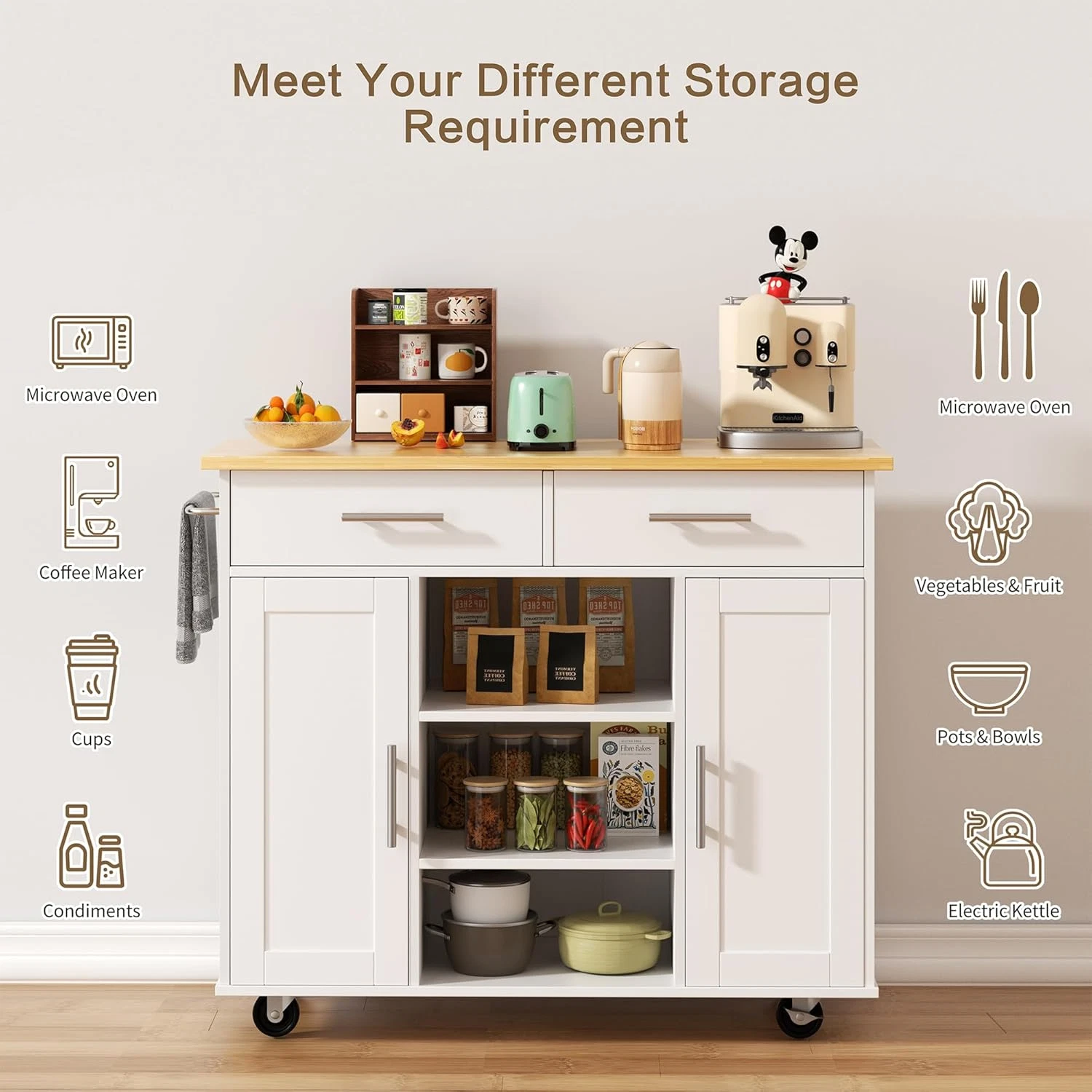 Move the kitchen island wherever you need it most. Built with five universal caster wheels—including two lockable ones and a stabilizing middle wheel—it ensures smooth mobility and steady placement during use.