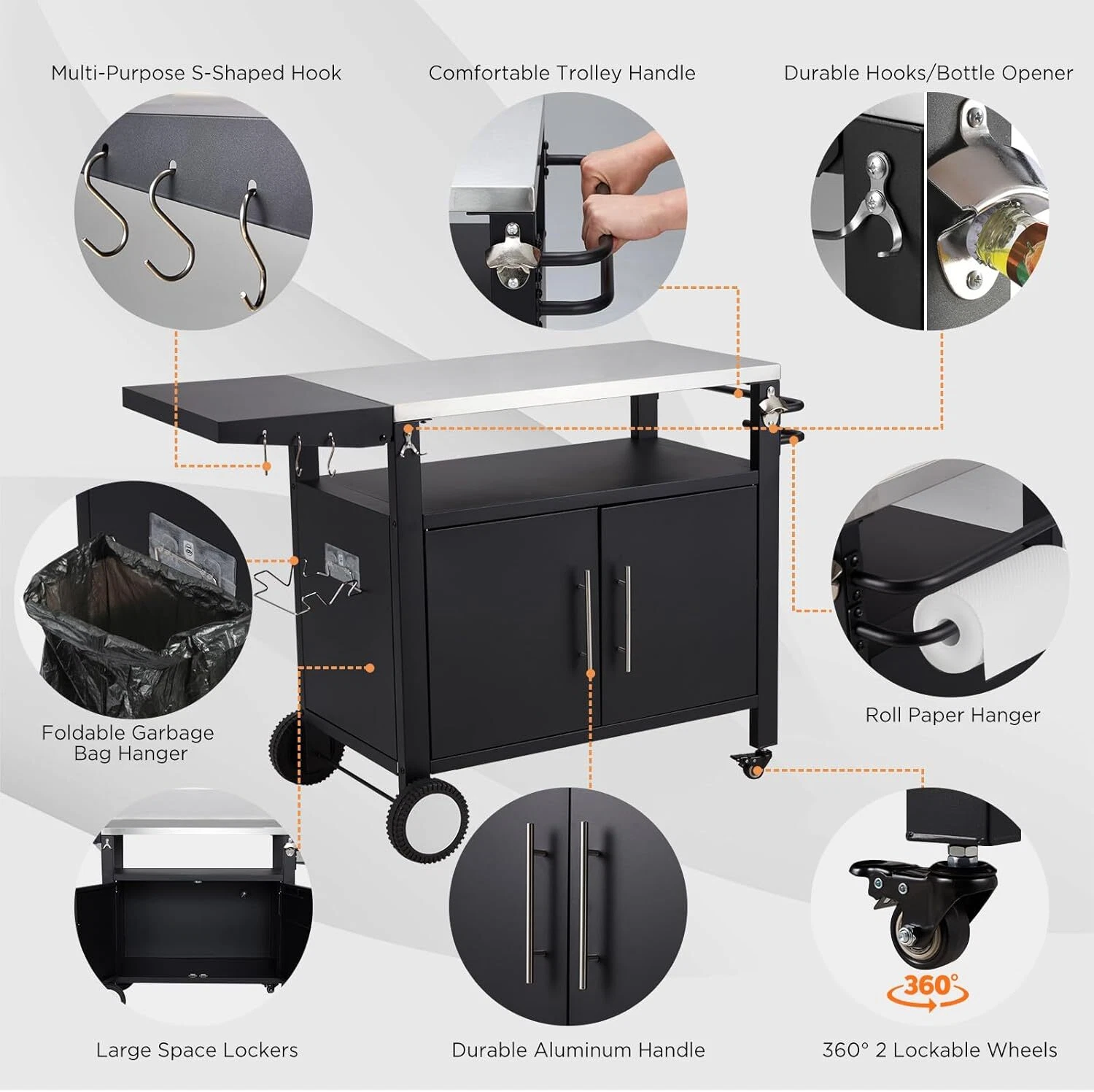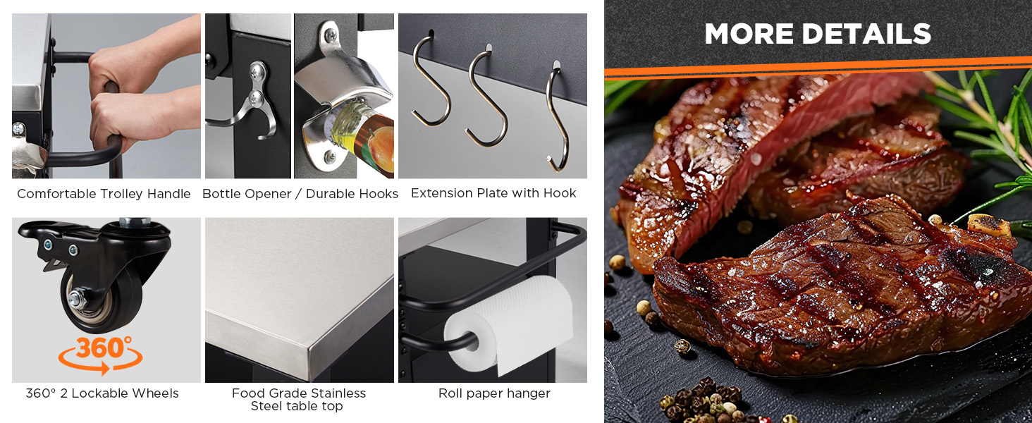 Featuring a generous 50-gallon enclosed cabinet (with pipe access for small gas tanks) and a 20-gallon open shelf, this grill cart offers flexible storage. The stainless steel table top (32.4’’ × 17.5’’) expands to 50’’ with an extension plate, giving you ample workspace and customizable storage options.